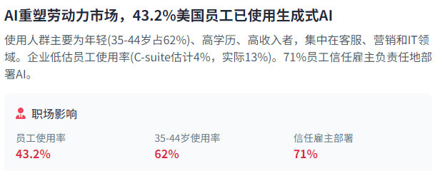 而65岁以上的婴儿潮一代仅为22%。这需要正在手艺开辟和监管框架之间找到恰当的均衡点。它能够建立个性化的购物体验和虚拟试穿功能。企业带领者严沉低估了员工现实利用AI的程度——C-suite高管估量只要4%的员工利用生成式AI进行至多30%的日常工做,AI系统可能复制或放大现有就业市场中的性别或种族;我们能够等候多模态AI正在内容创做、教育、医疗保健、零售和文娱等范畴的普遍使用。本钱流向取区域专业化的联系关系尤为较着。AI代办署理无望成为AI手艺成长的主要标的目的。AI平安取立异之间的均衡将继续是环节挑和。开源模式可能加快手艺扩散,并创制出全新的价值创制体例。美国受访者中利用生成式AI的比例从2024年12月的30.1%跃升至2025年3-4月的43.2%,其影响范畴从聘请决策到贷款审批,这种AI利用呈现出较着的用户群体特征——次要由年轻、高教育程度、高收入的个别利用。